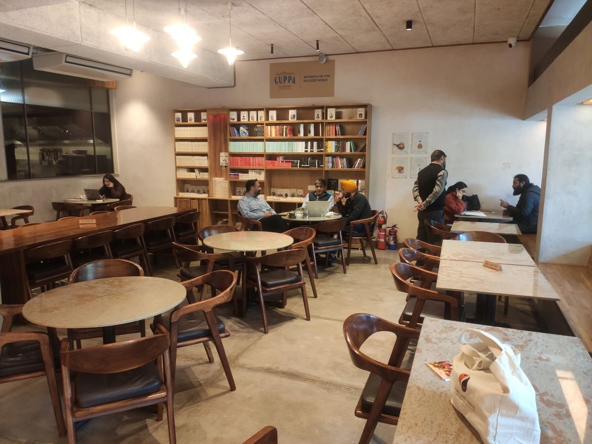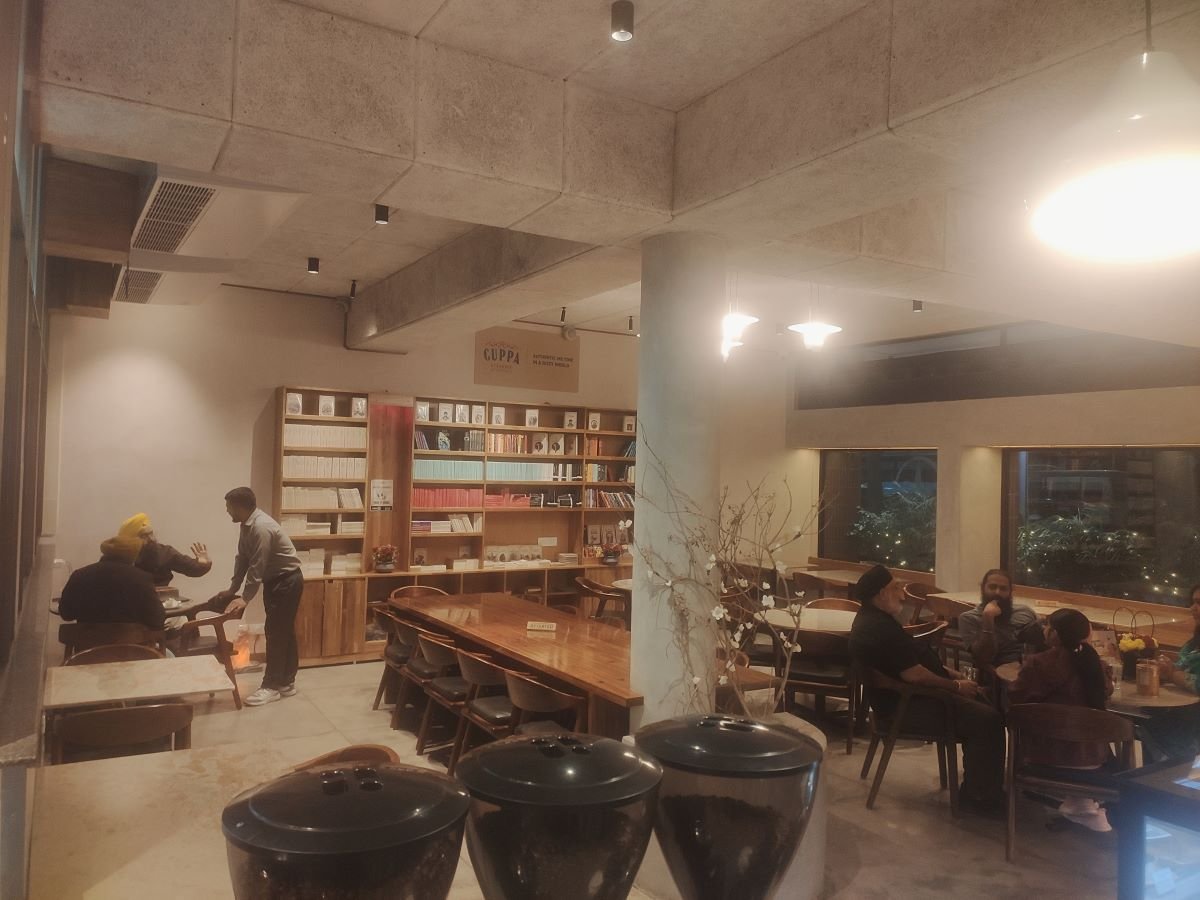 As in all their cafes, the décor and furniture at Café Well-Being, Sector 22 are minimalistic and sustainable. Here even the walls are painted with natural lime.